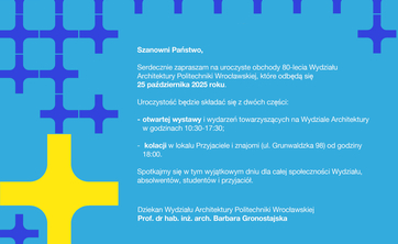 Już za równy miesiąc obchodzić będziemy jubileusz 80-lecia Wydziału Architektury Politechniki Wrocławskiej, na którego obchody 25 października 2025 serdecznie wszystkich zapraszamy.więcej