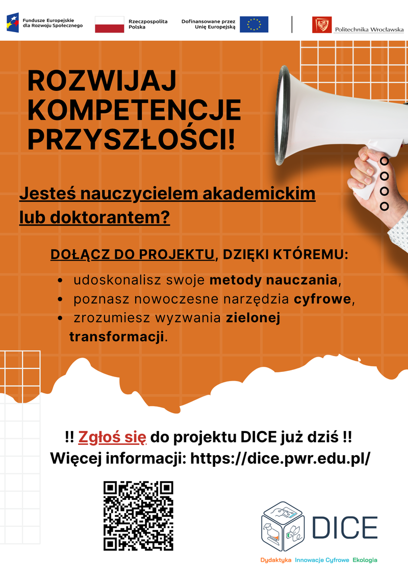 W razie pytań prosimy o kontakt: kontakt.dice@pwr.edu.pl lub bezpośrednio u Pani Aleksandry Piechoty aleksandra.piechota@pwr.edu.pl